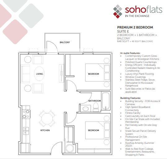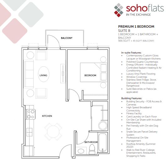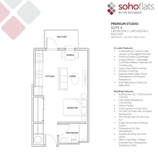 Come home to Soho Flats and benefit from the excitement and convenience of living in one of Winnipeg's most dynamic neighbourhoods!  Easily accessible to local businesses, shopping, dining, theatre, and nightlife, Soho Flats is also a short walking distance to Red River College, Old Market Square, and Portage and Main.